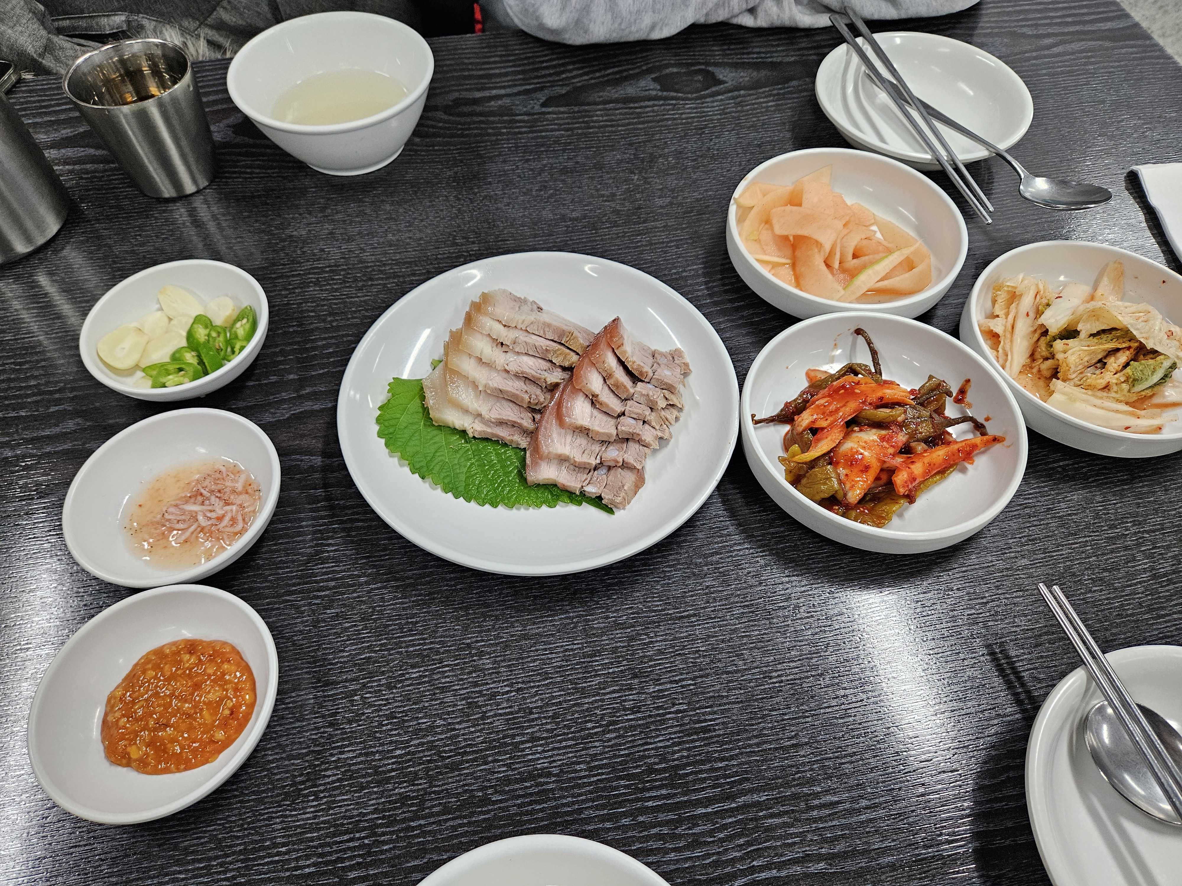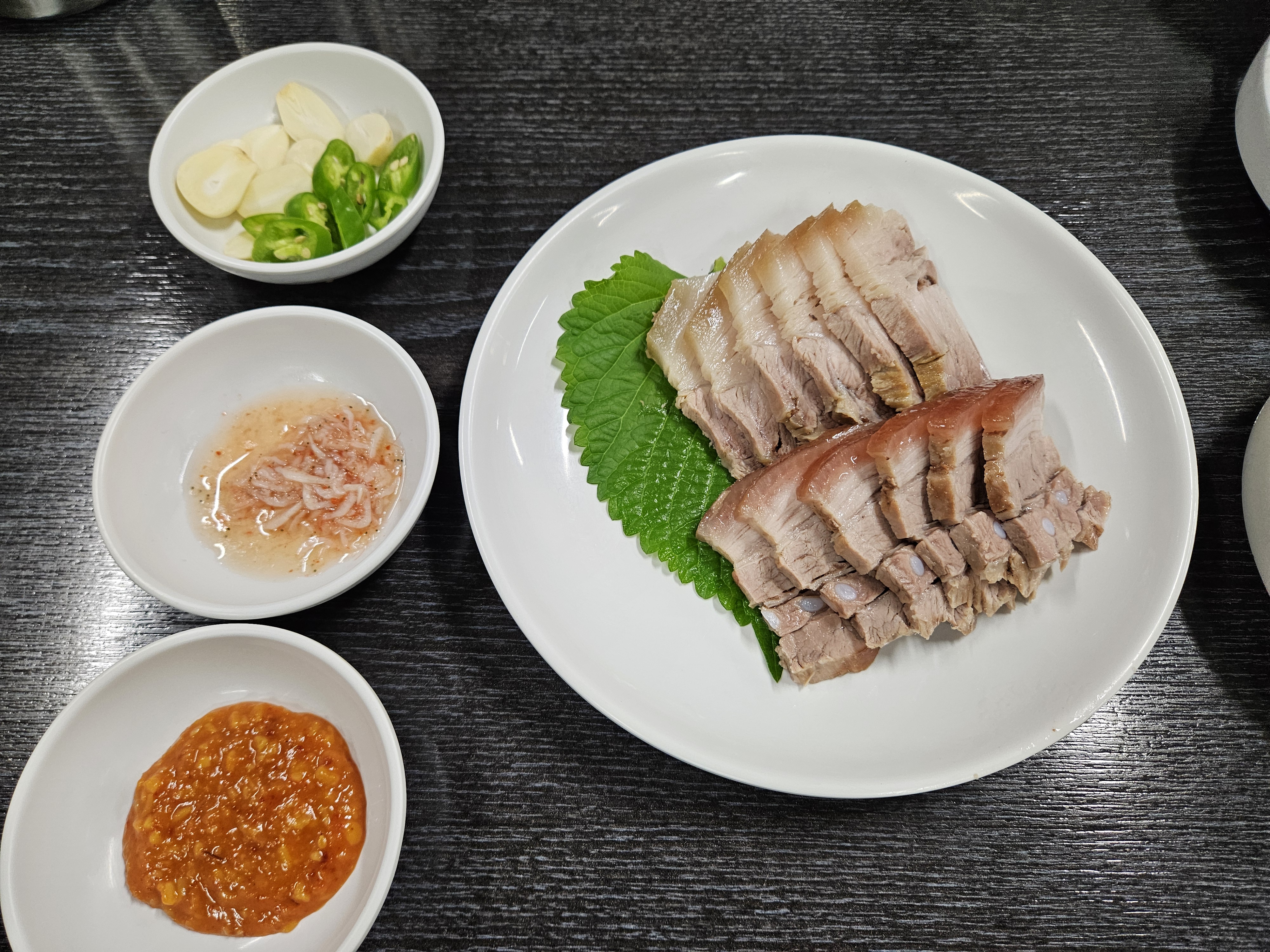 수육에 쌈장, 새우젓, 고추, 마늘을 올려먹으면 진짜 맛있다.