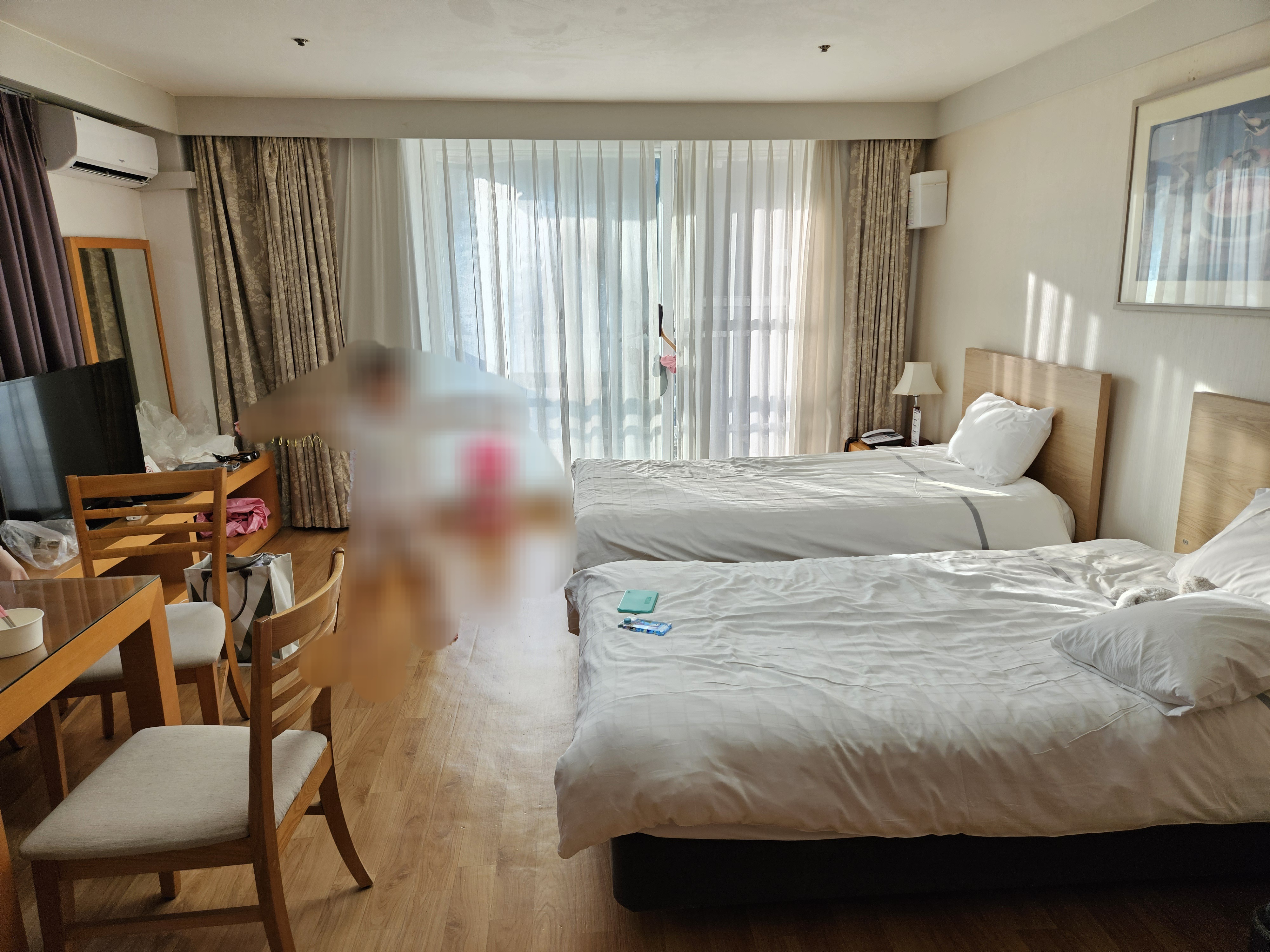 지어진지 꽤 되어서 연식이 있는 내부 모습이에요. 침대는 싱글사이즈 2개 있고, 4인식탁도 있어서 포장해서 식사하기에도 편리했어요. 장에 추가 요와 이불이 준비되어 있어서 3인 가족 모두 편하게 휴식을 취할 수 있었어요.