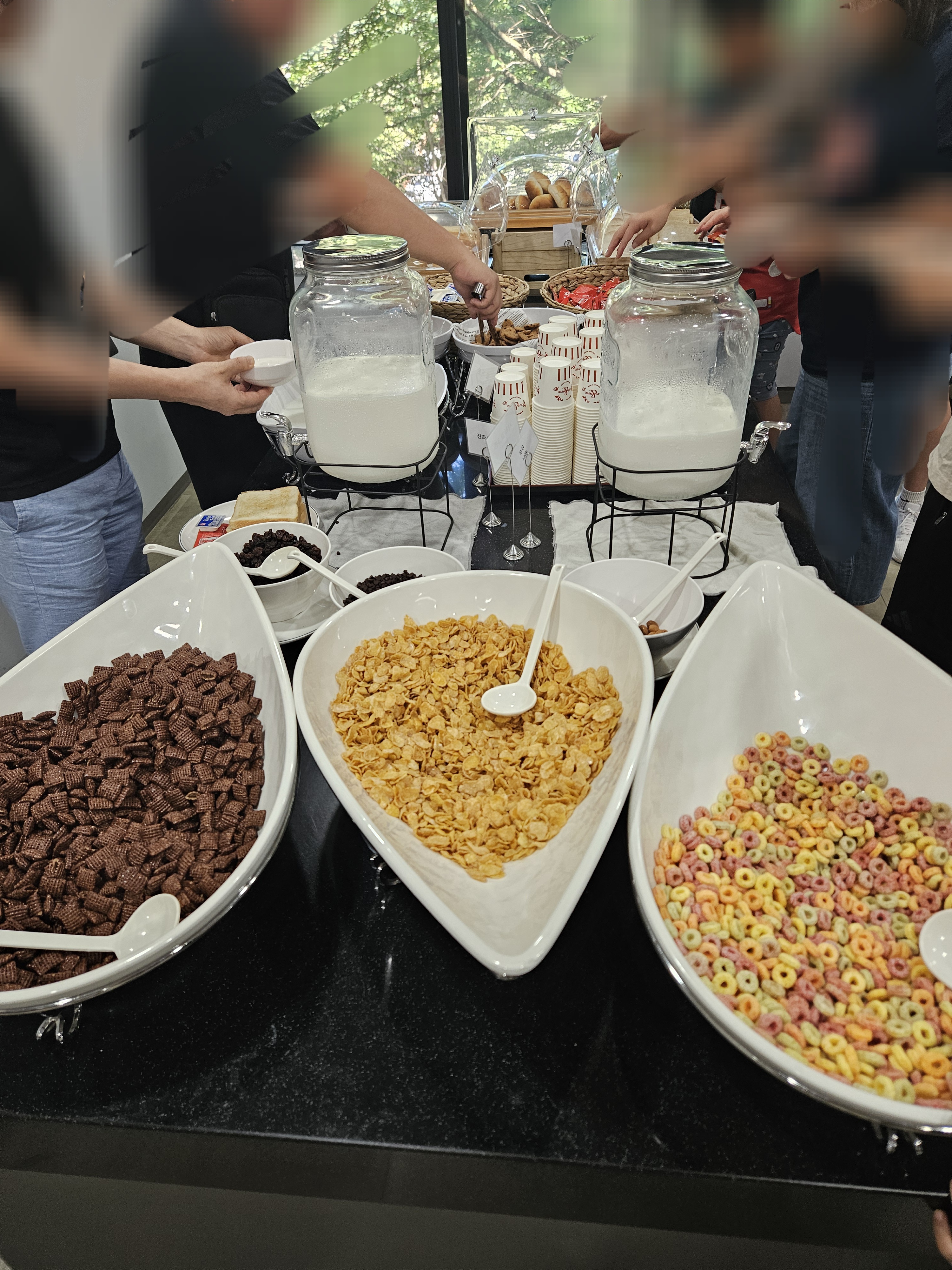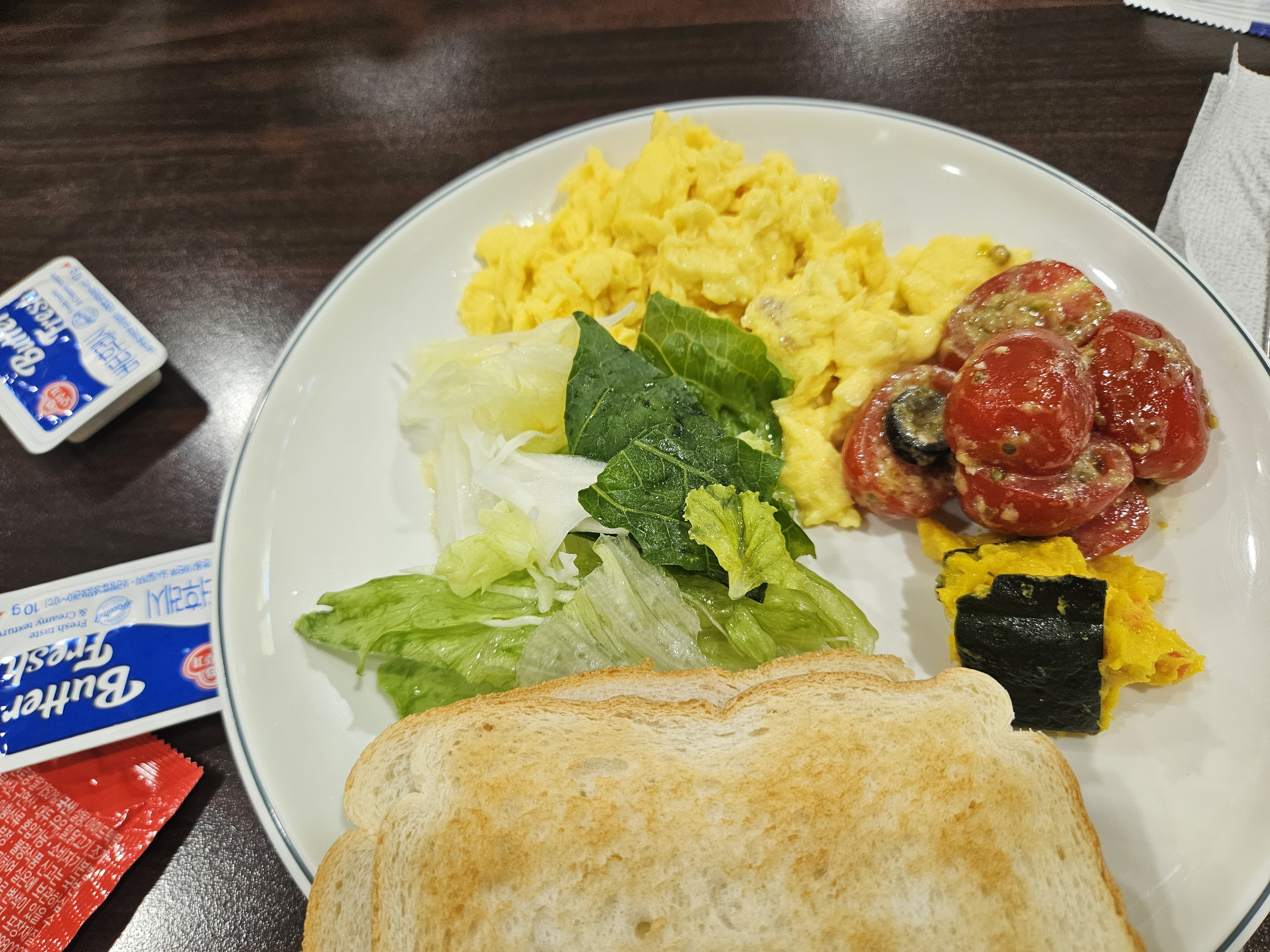 학생 때 수련회 가면 있던 조식식당 분위기에요. 한식, 식빵, 채소, 과일, 시리얼 등등 은근히 먹을 게 많아서 오랜만에 배불리 아침식사를 했어요.