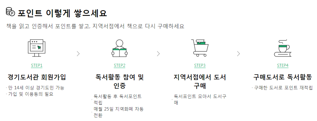 - 경기도민이 아닌 경우, 플랫폼을 열람할 수는 있으나 독후활동 기록을 통한 포인트는 받을 수 없음