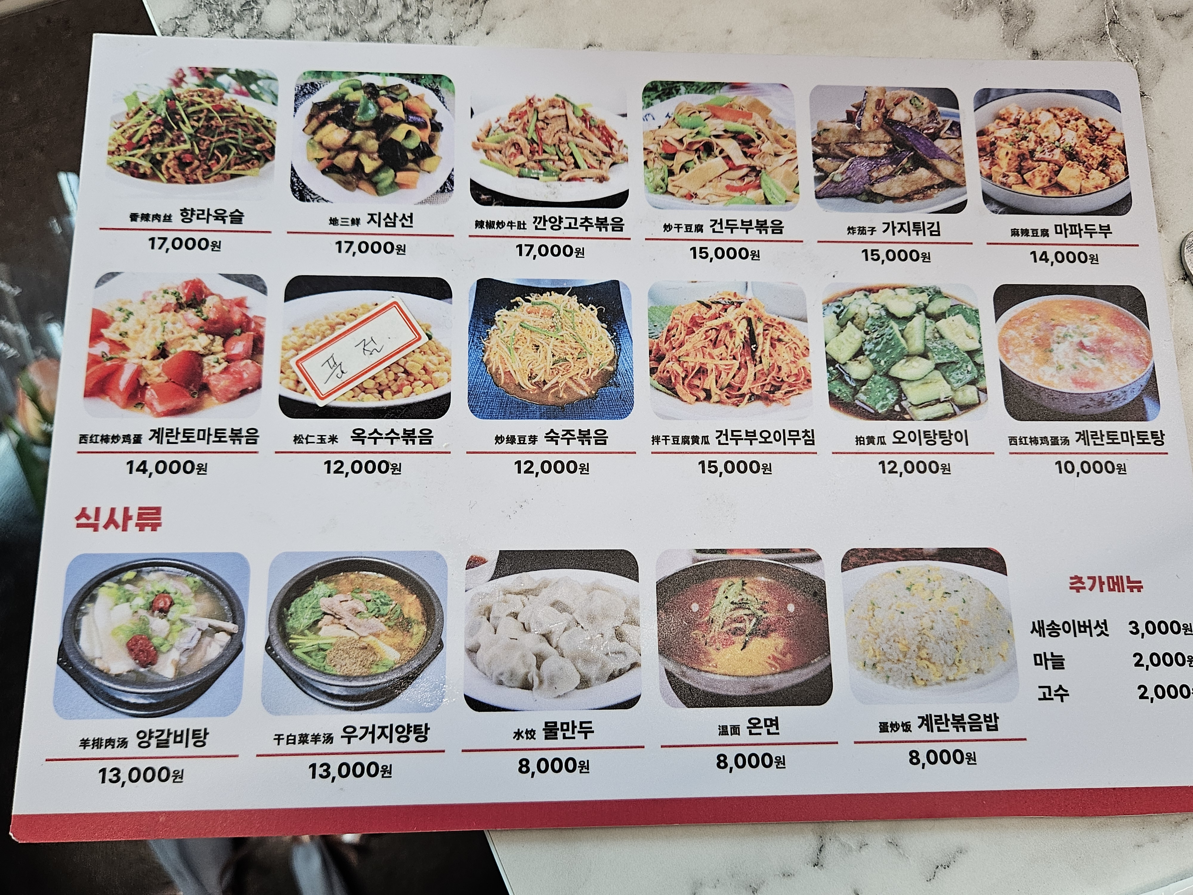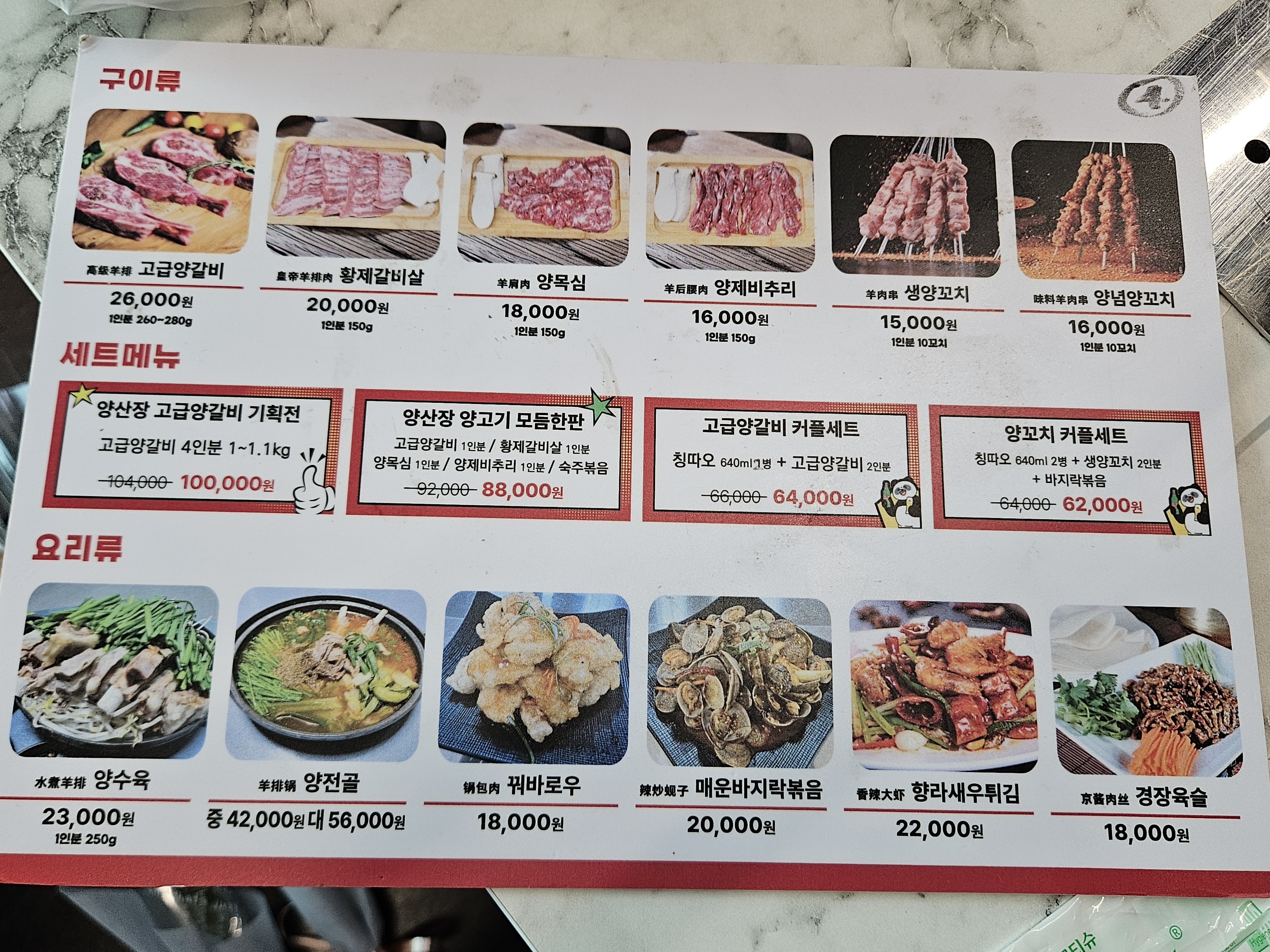 양갈비, 양꼬치, 양수욕, 양전골 등 숙성양고기요리를 전문으로 하는 식당에요. 저희가 좋아하는 경장육슬이 있어서 반가웠고 그 밖에도 꿔바로우, 바지락볶음, 깐양고추볶음 등등 먹고 싶은 메뉴가 많았어요.