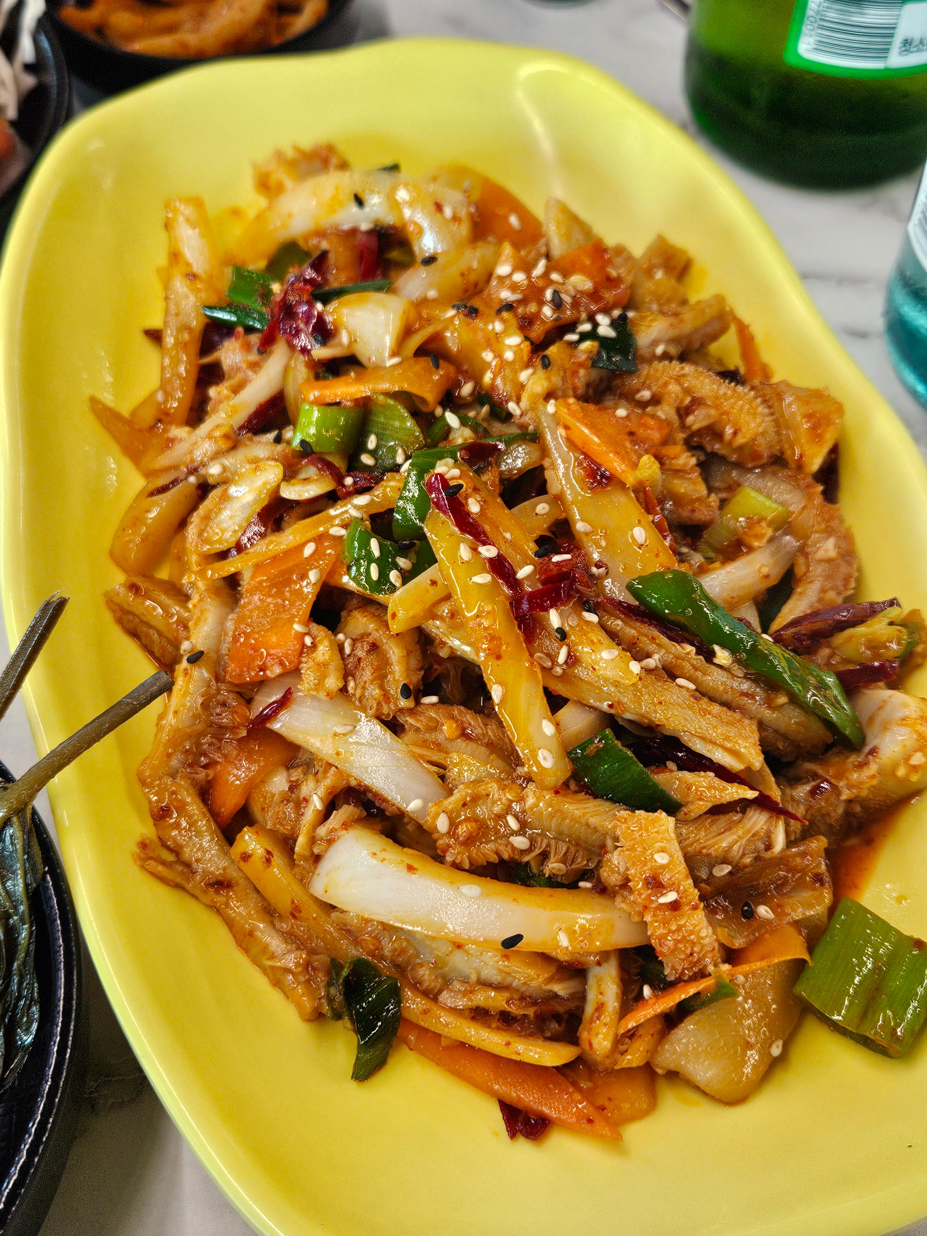 한번도 안먹어본 요리라서 궁금해서 주문해보았어요. 고추가 들어가서 매콤하면서 부드러운 양이 쫄깃해서 술안주로 제격이었어요.