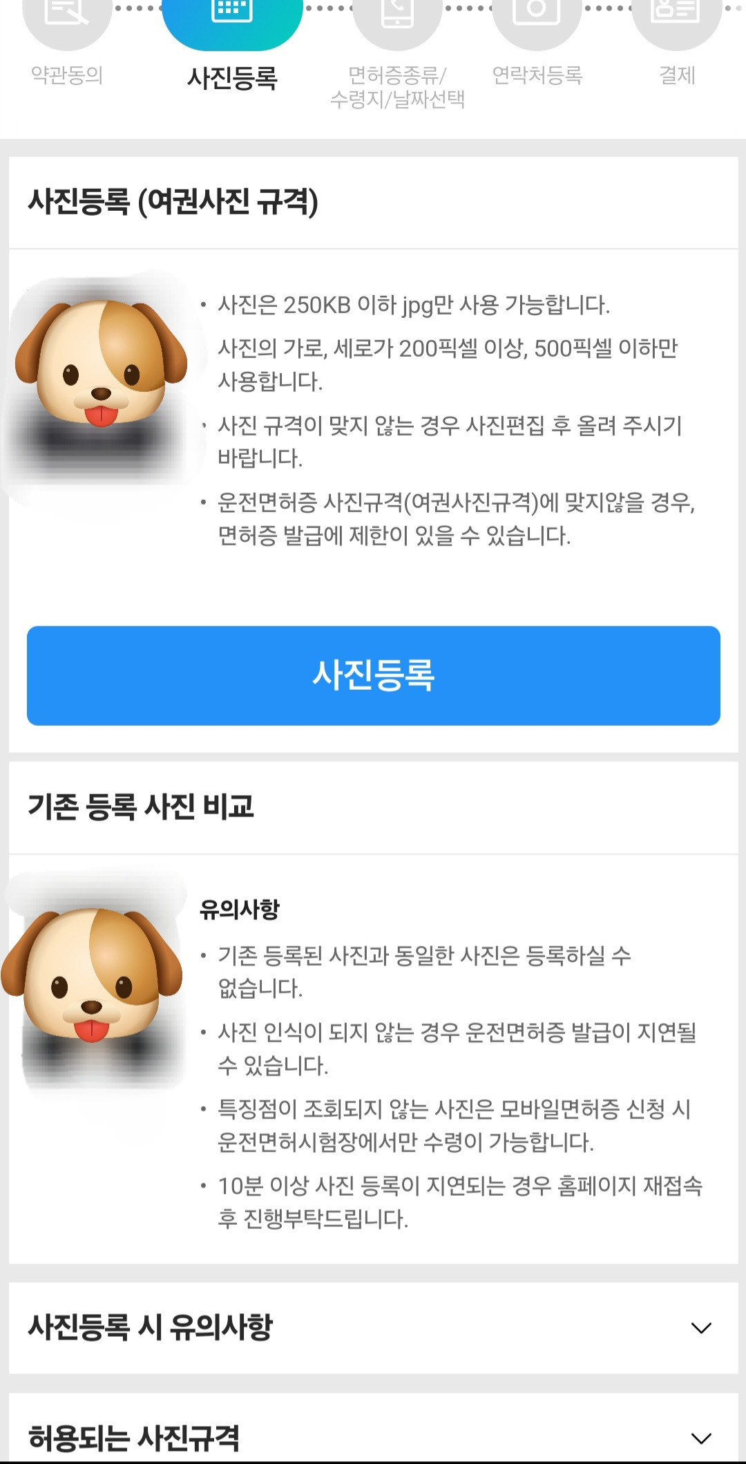 ▷ 사진파일 업로드 ▷ 면허증종류 선택 ▷수령방법 선택 ▷수령날짜선택