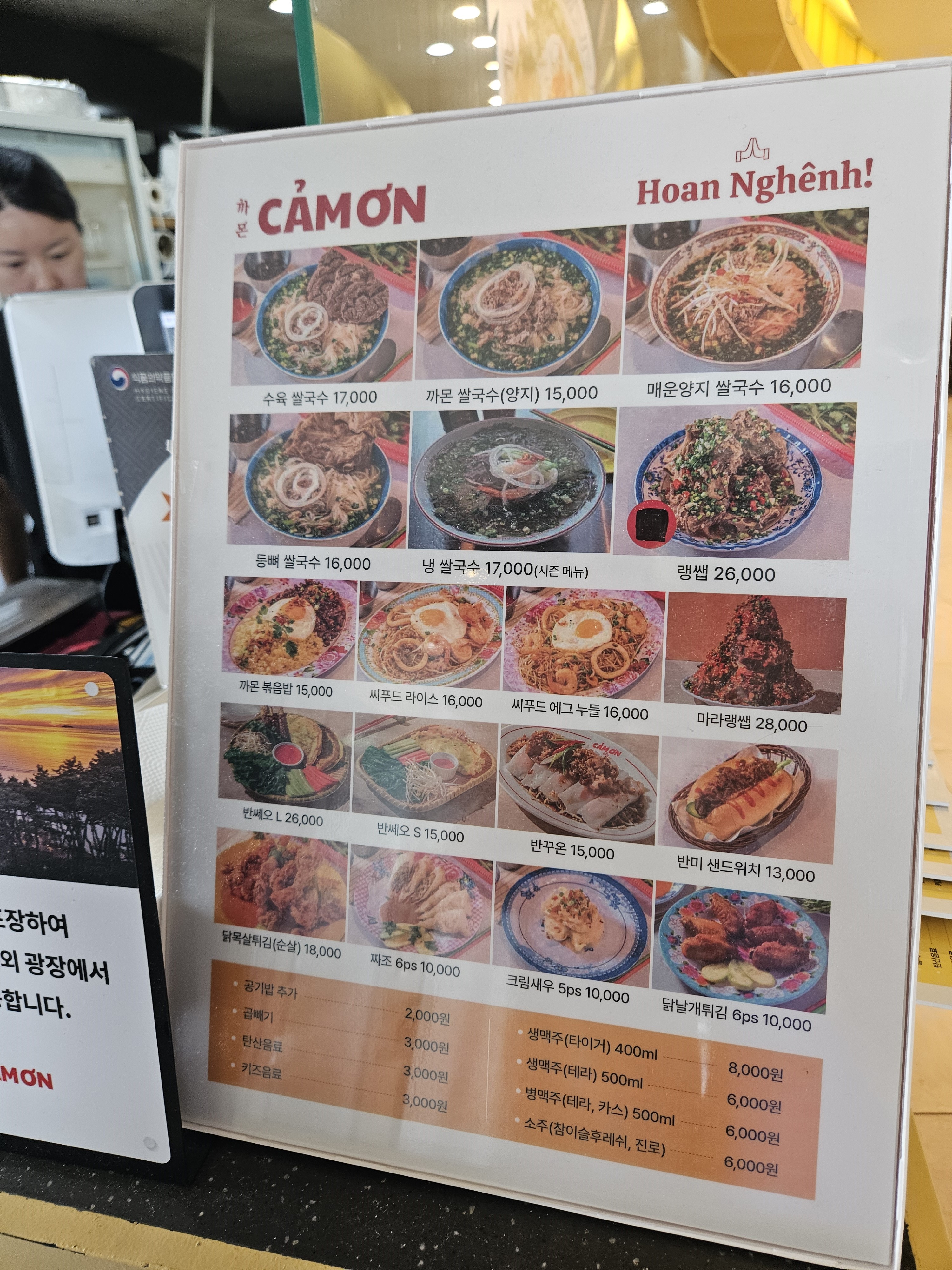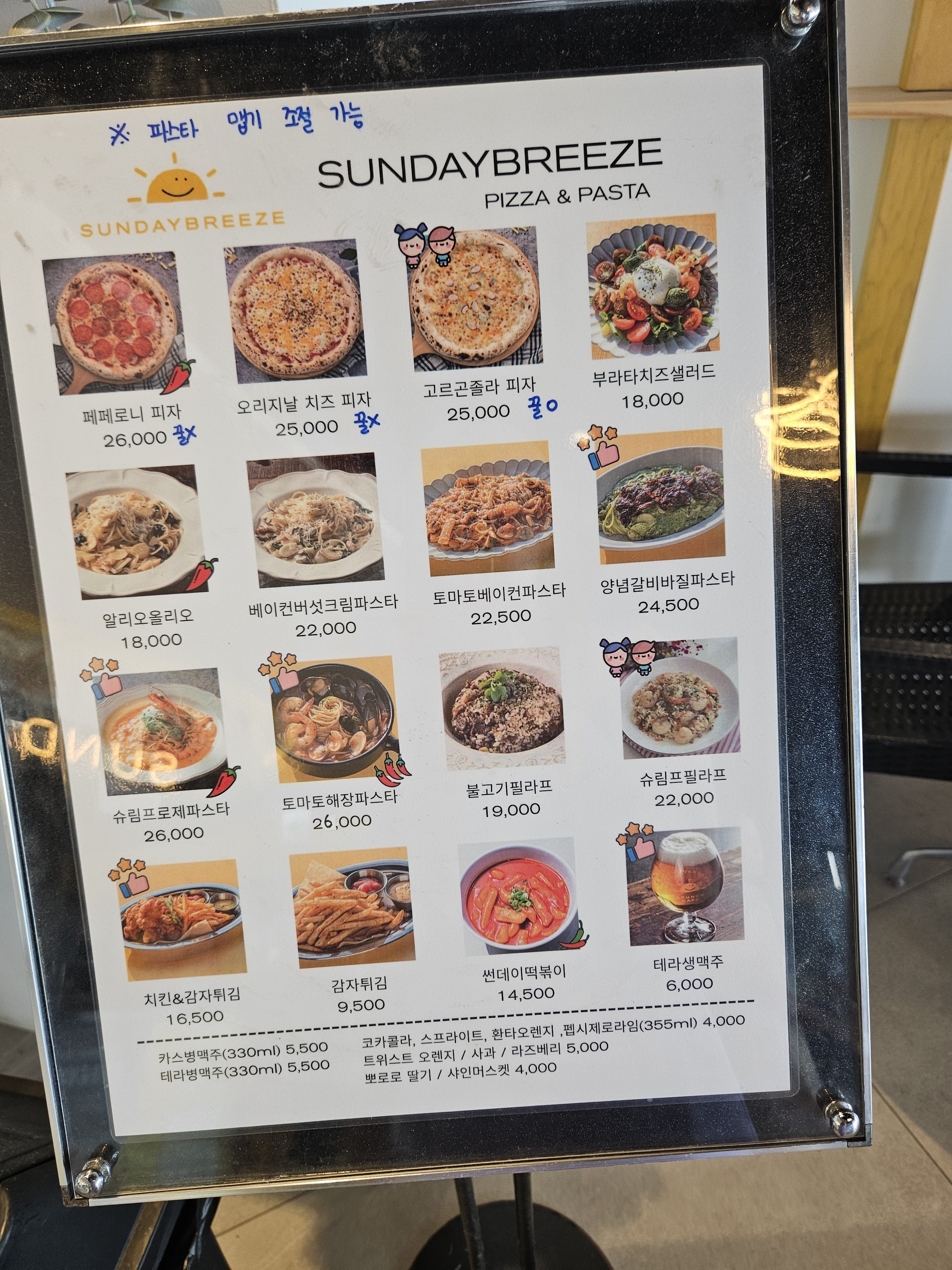 썬데이브리즈와 까몬 메뉴판이에요. 메뉴가 다양하게 있어서 아이는 크림파스타, 어른은 뜨끈하게 쌀국수로 한끼를 해결했어요. 여기도 뷰가 좋아서 식사하면서 잠깐 휴식하기 좋았어요.