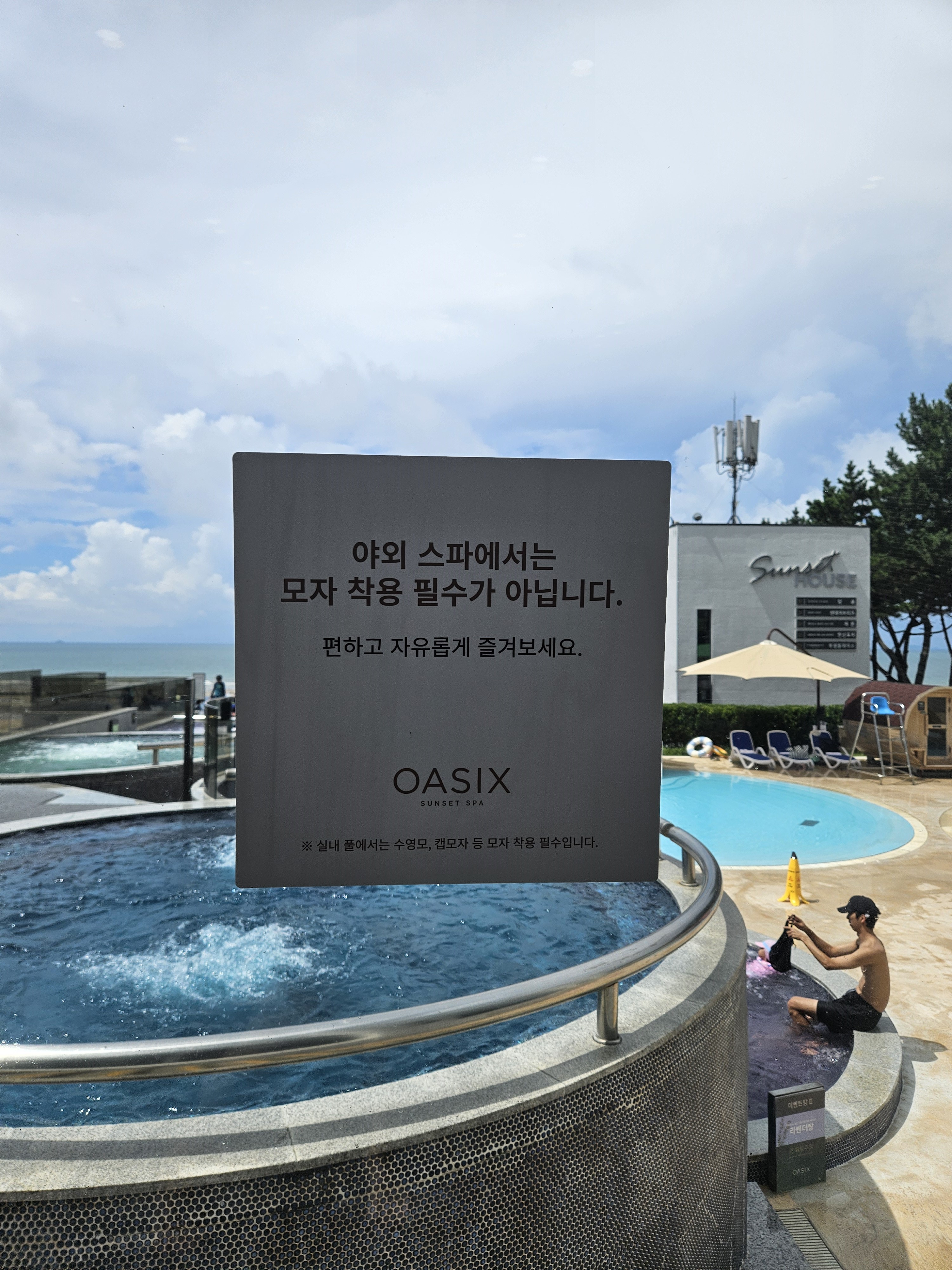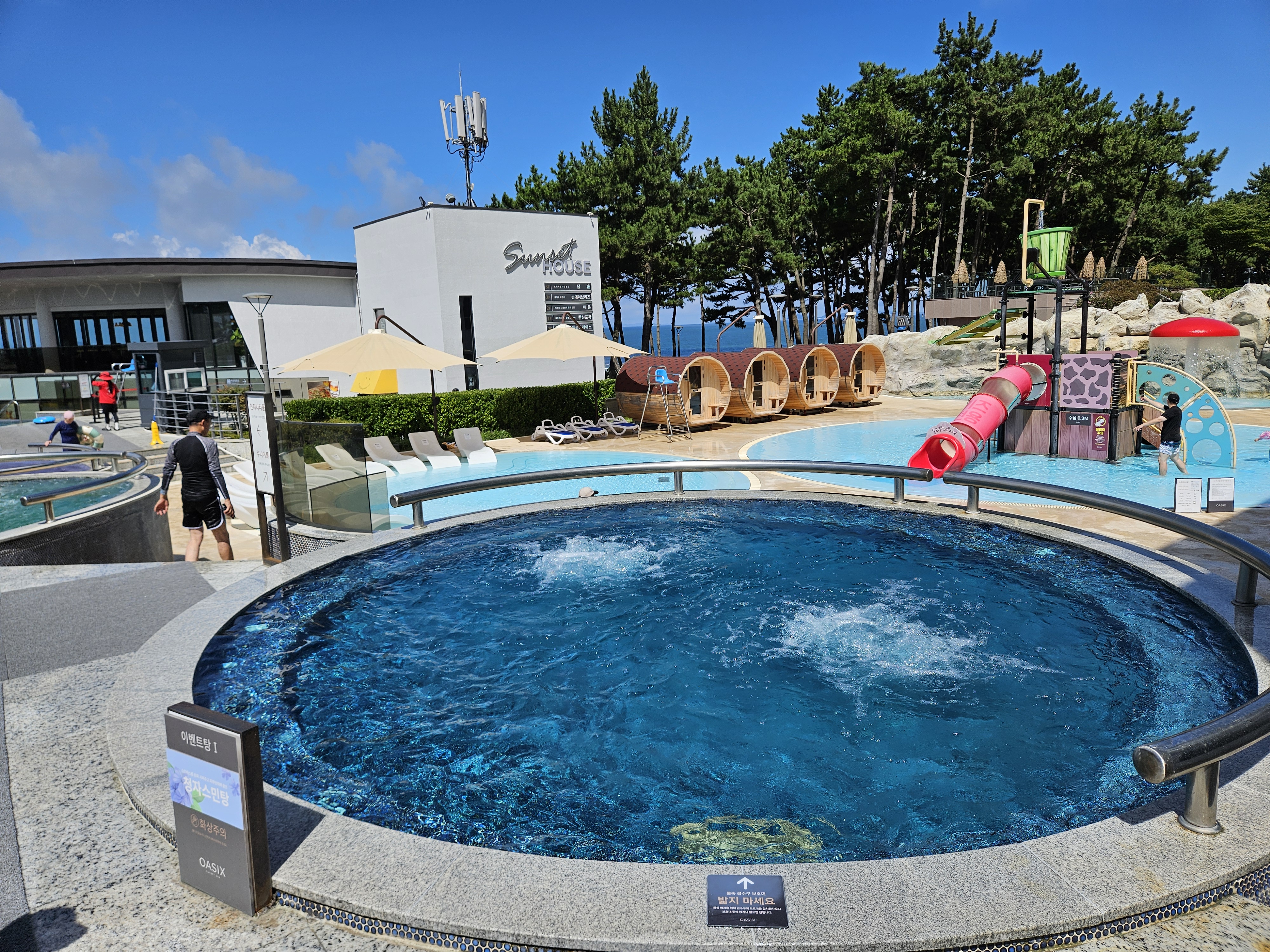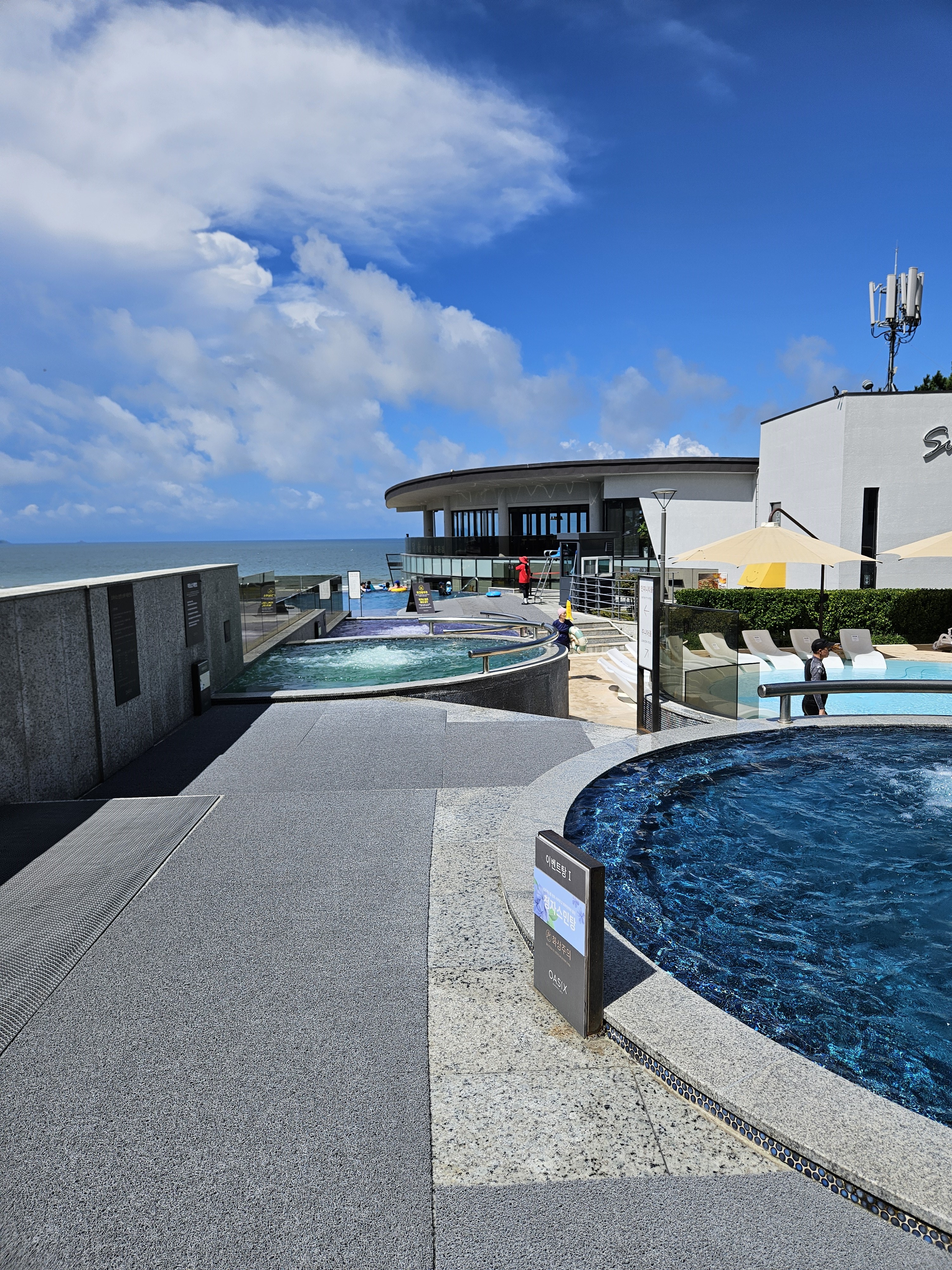 온천풀 종류가 많아서 흥미로웠고 키즈풀에 슬라이드도 있고 은근 알차더라고요. 인피니티풀에서는 바다가 시원하게 펼쳐져서 선셋을 즐기기에도 좋았어요.
