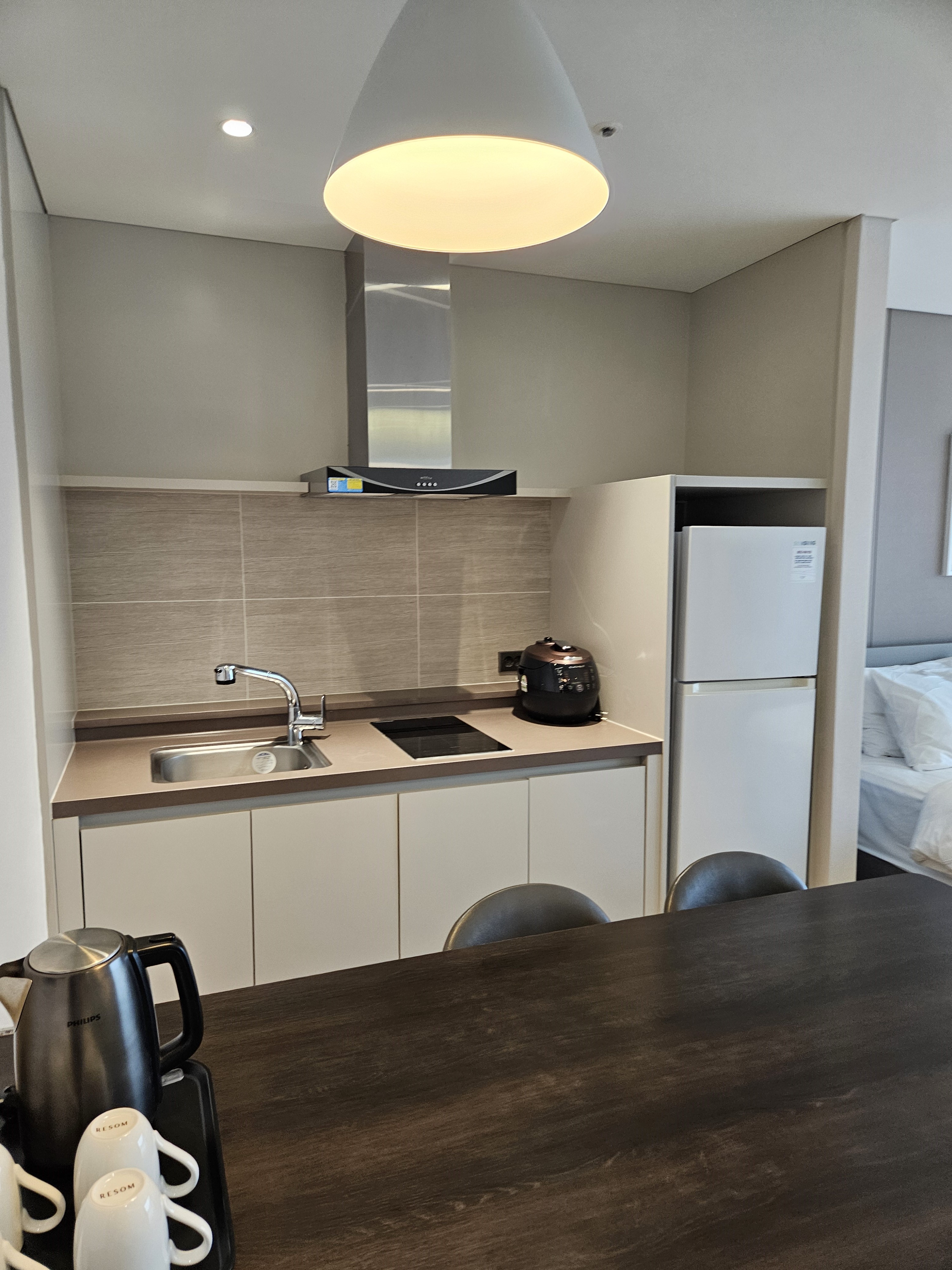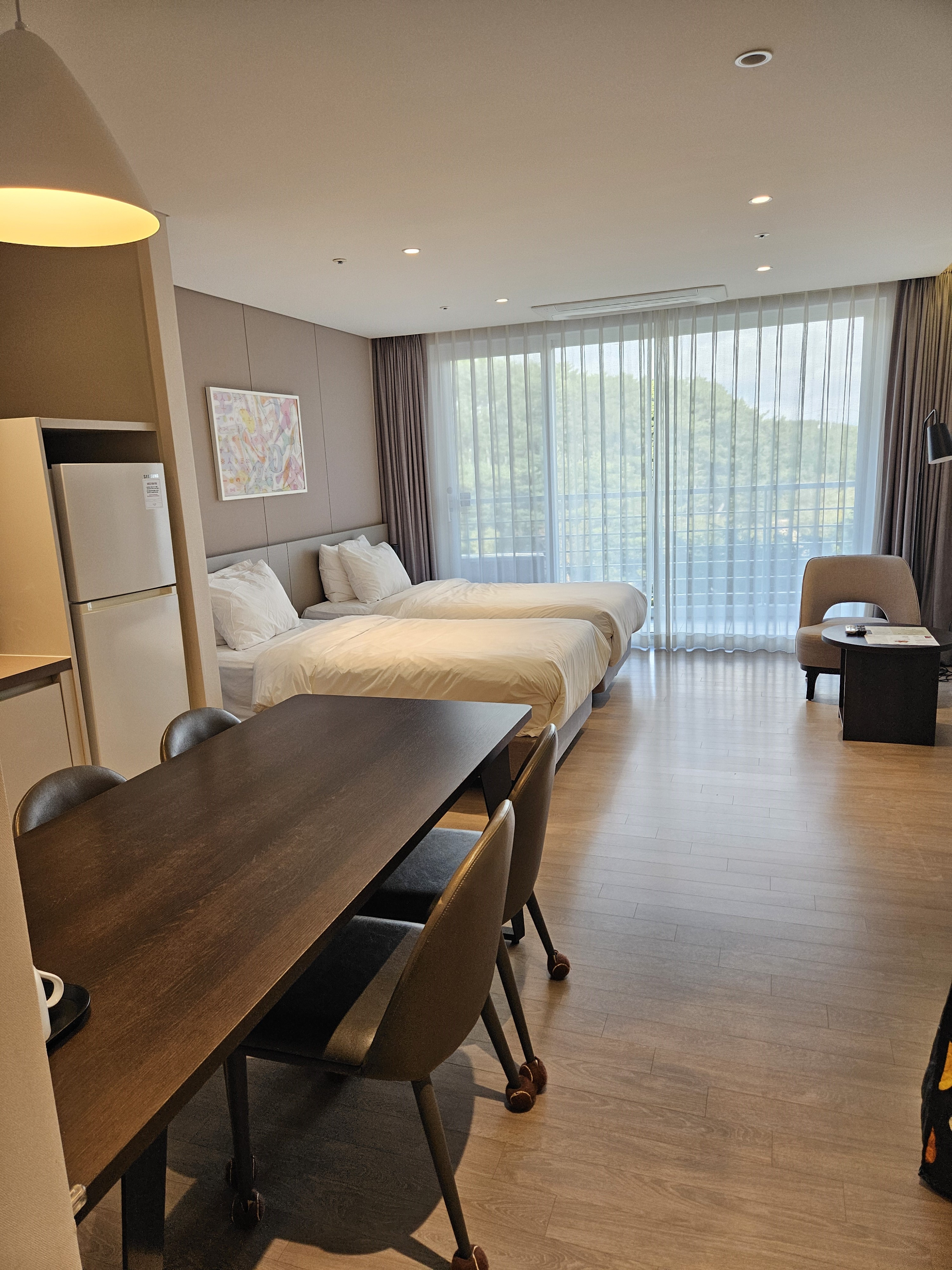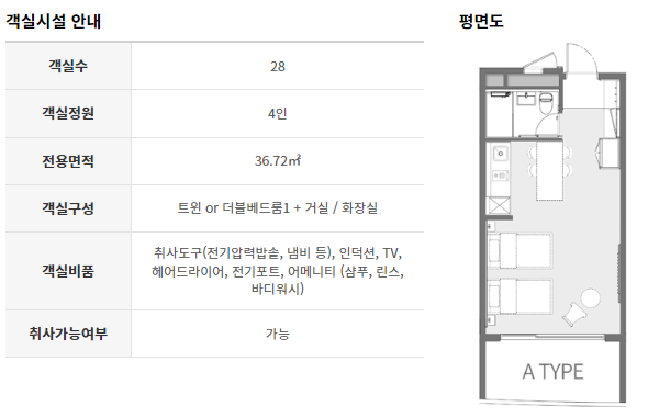 S20은 11평정도 크기에요. 저희는 트윈베드를 선택했어요. 전기밥솥, 냄비, 간단한 식기류, 샴푸, 린스, 바디워시 등 구비되어 있었어요. 4인 기준 룸이어서 요와 이불도 2세트 있었어요. 그리고 큰 테이블이 있어서 방에서 식사하기에 번잡스럽지 않아서 편했어요.