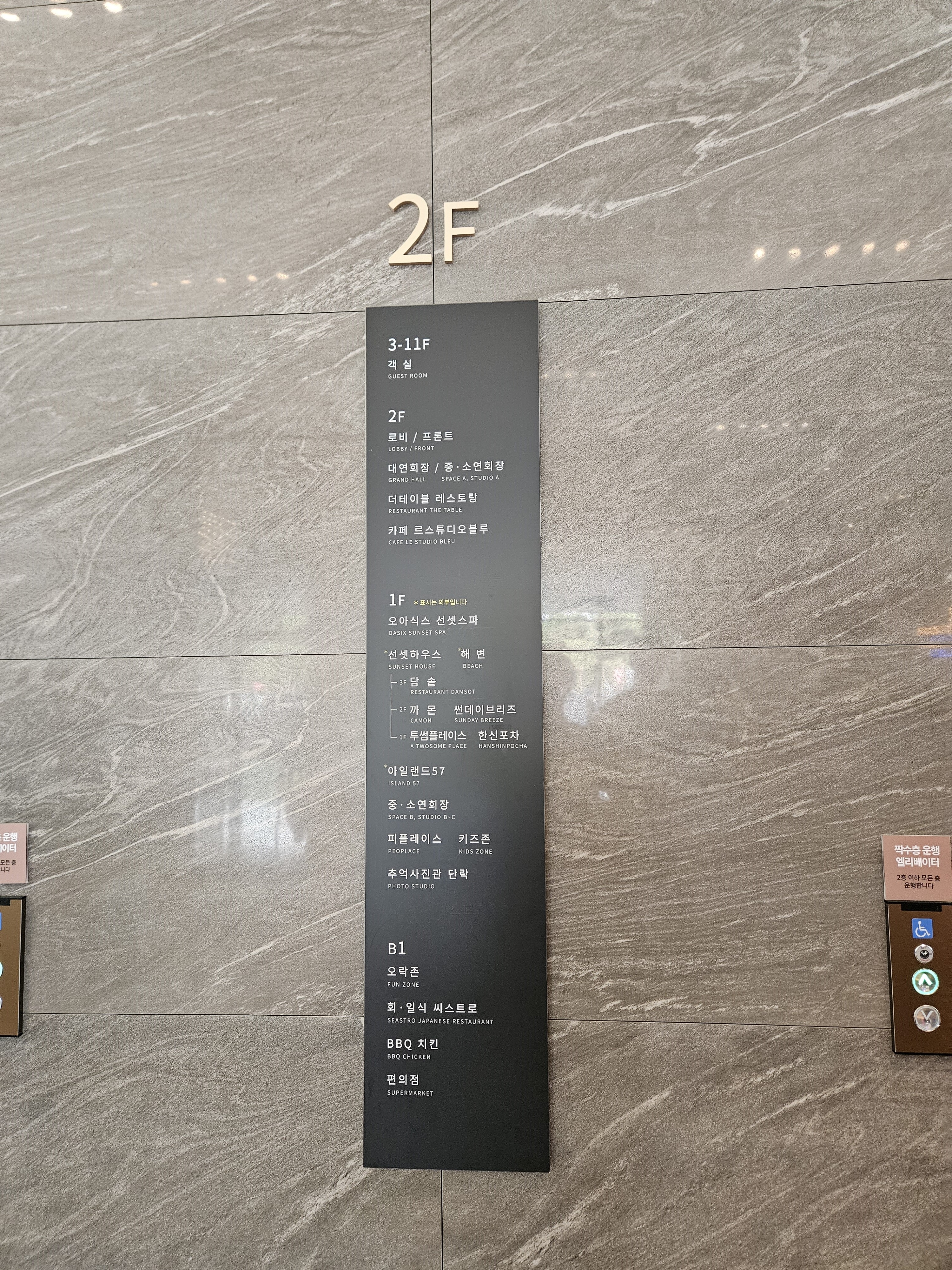 아일랜드 리솜 전체지도에요. 로비(체크인하는곳)이 2층이고 1층에는 오아식스 스파(수영장)이 있고 해수욕장으로 나갈 수 있게 연결되어 있어요. 그리고 1층에는 7세까지 이용가능한 키즈룸도 있어요. 지하1층에는 식당과 편의점, 오락존이 있고, 3층부터 11층은 객실이에요. 엘리베이터가 홀수층. 짝수층 나누어져 있어서 생각했던 것보다는 엘리베이터 이용에 불편은 없었어요.